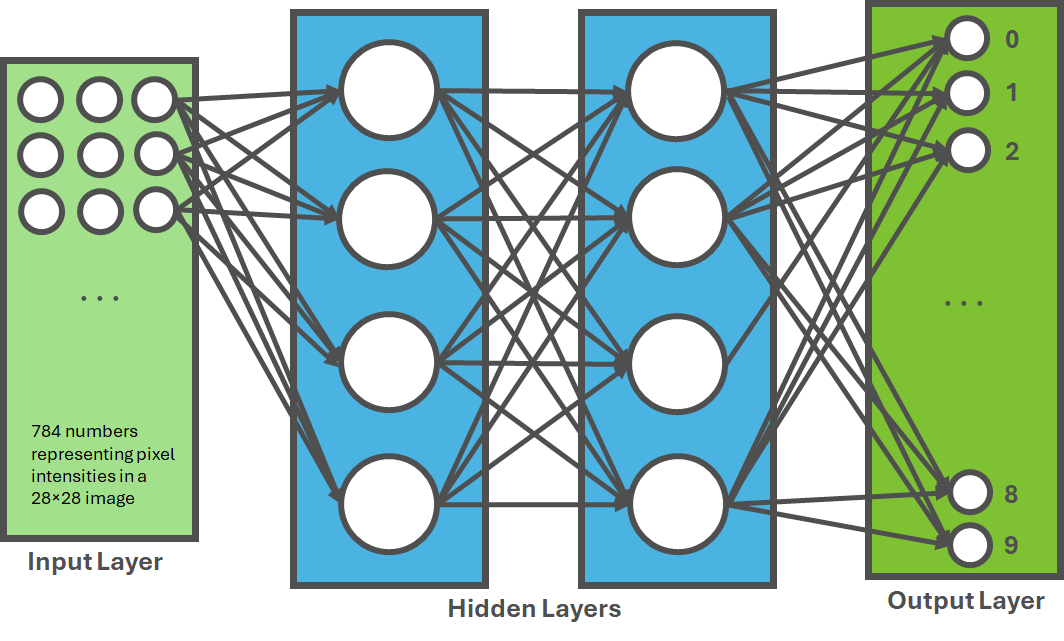 Input vector: 784 numbers representing pixel intensities in a 28×28 image