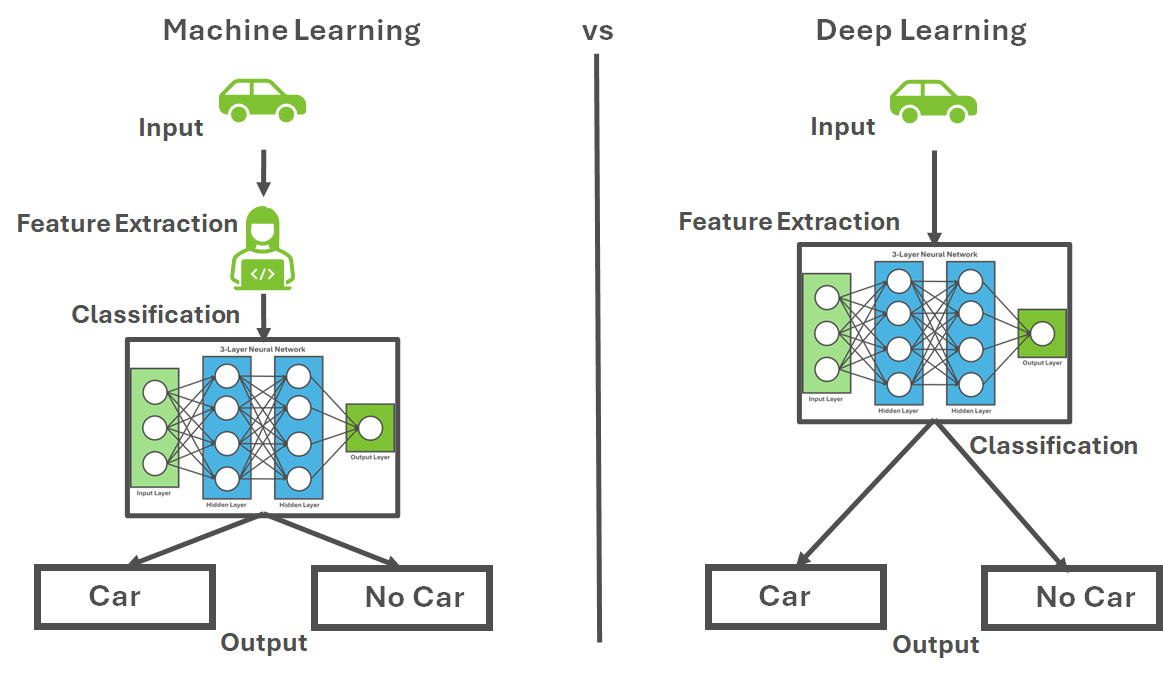 Consider for example, autonomous vehicles, which use convolutional neural networks (CNNs) —a specialized type of deep learning architecture—to process camera feeds and identify pedestrians, traffic signs, lane markings, and other vehicles in real-time, making driving decisions in milliseconds based on these inputs.