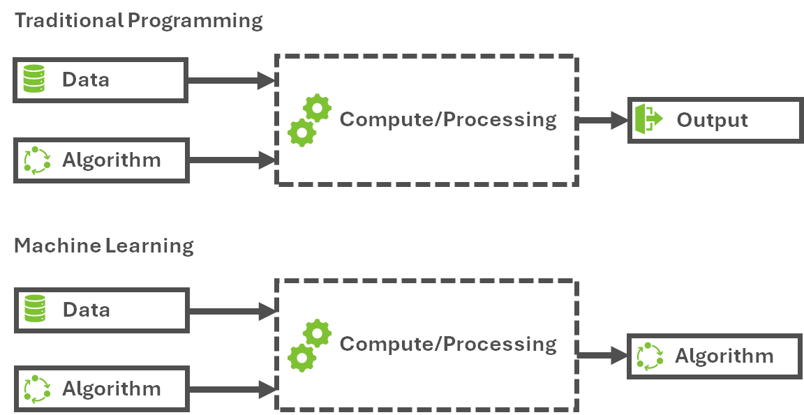 It's clear then that both machine learning in general and deep learning in particular change the common paradigm for analytics. Instead of developing algorithms to specifically instruct a computer system on how to solve a problem, a model is developed and trained so that the system can "learn" and solve the problem by itself (Figure 4).