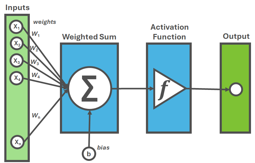 These weighted inputs are summed together and passed through an activation function (like ReLU or sigmoid)1 that determines whether and how strongly the neuron "fires"
