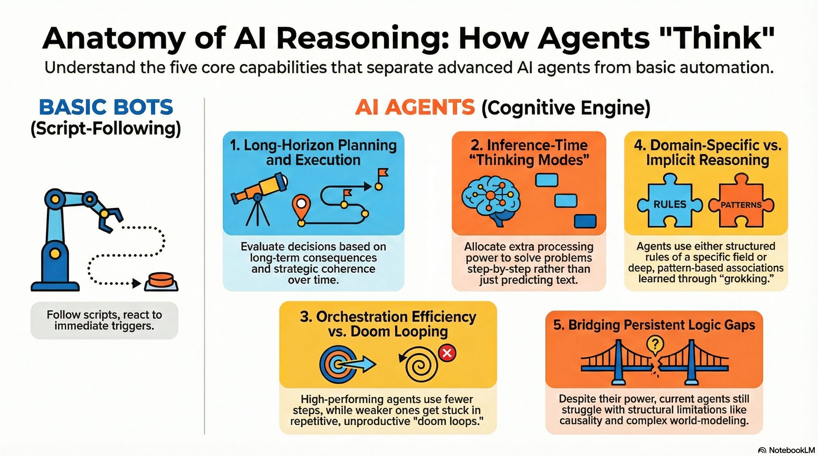 AI agents differ significantly in their reasoning capabilities based on their level of autonomy, their ability to perform long-horizon planning, and the amount of inference-time computation they employ.